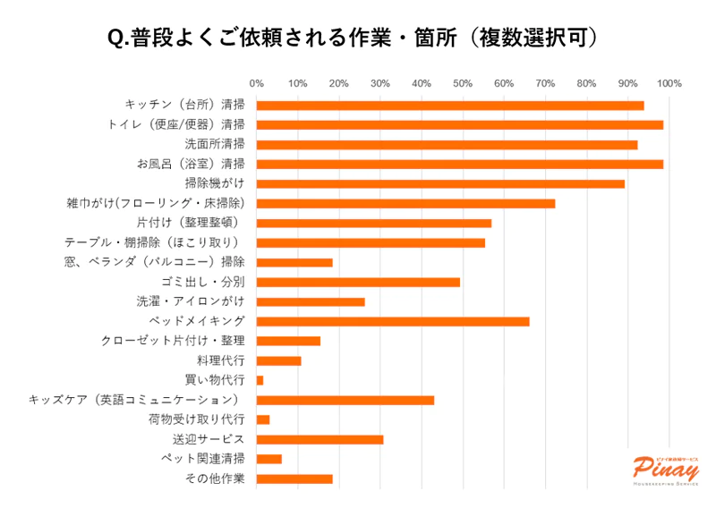 上記のグラフは、ピナイ家事代行サービスで実際によく依頼されている作業内容を示したものです。