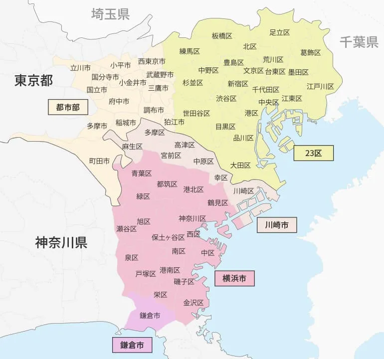 中央区 / 千代田区 / 新宿区 / 港区 / 文京区 / 台東区 / 墨田区 / 江東区 / 品川区 / 目黒区 / 大田区 / 世田谷区 / 渋谷区 / 中野区 / 杉並区 / 北区 / 荒川区 / 板橋区 / 足立区 / 葛飾区 / 練馬区 / 江戸川区 / 豊島区