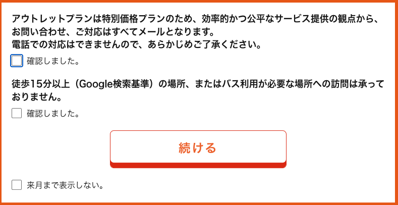 アウトレットプランは特別料金で提供されているため、問い合わせや連絡方法がメールに限定されています。